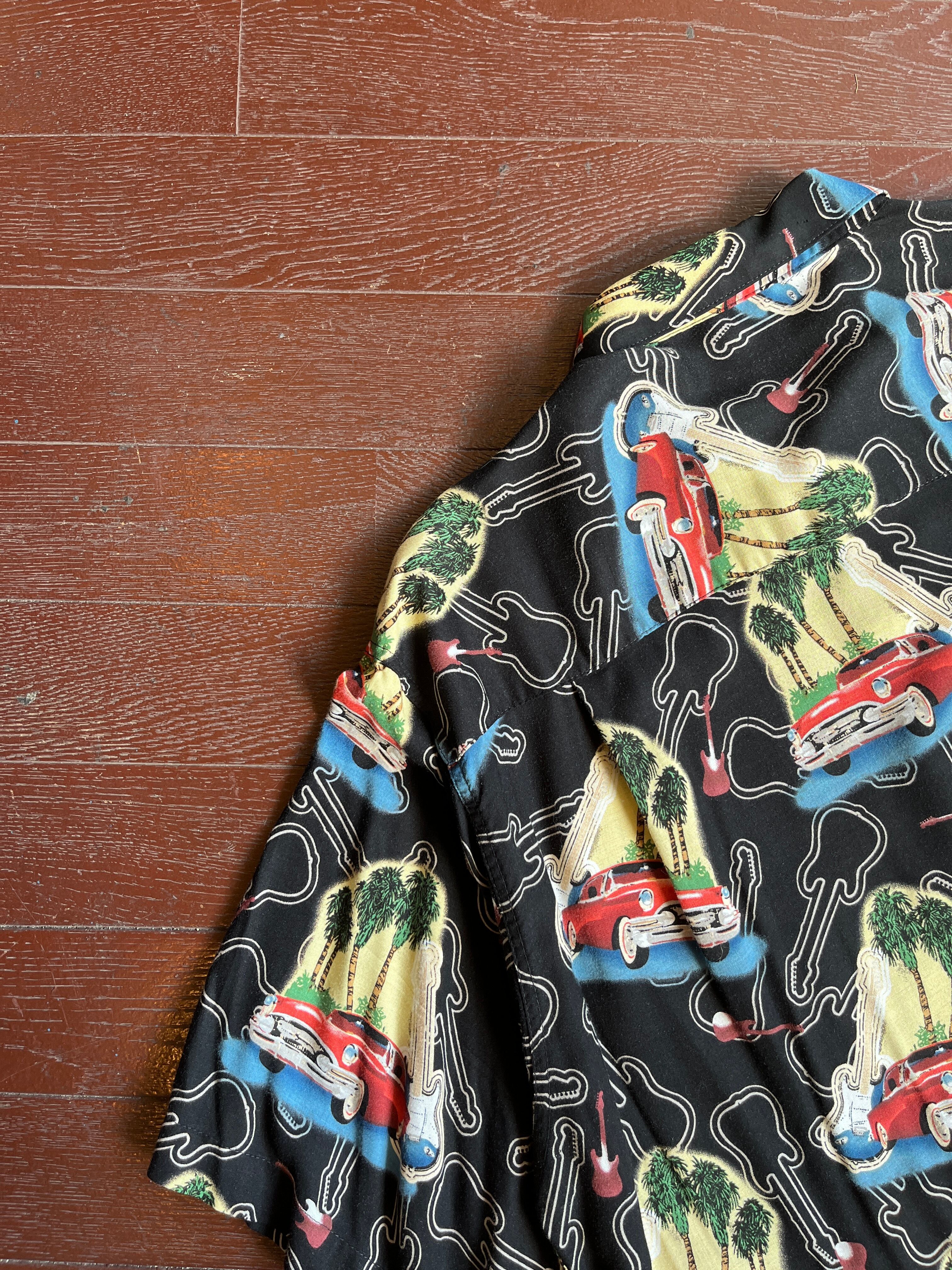 90's Imprints Guitar Chevolet Car Aloha shirt アロハ 柄シャツ シボレー 車 ギター